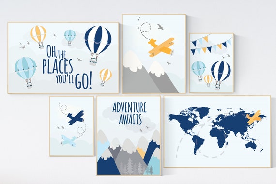 Mountain Adventure Nursery Art: Hot Air Balloon, Airplane, World Map Prints